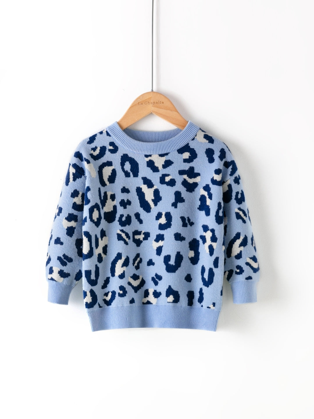 A blue pullover with a round neck, long sleeves, and a printed design, made from viscose rayon for a casual look.
