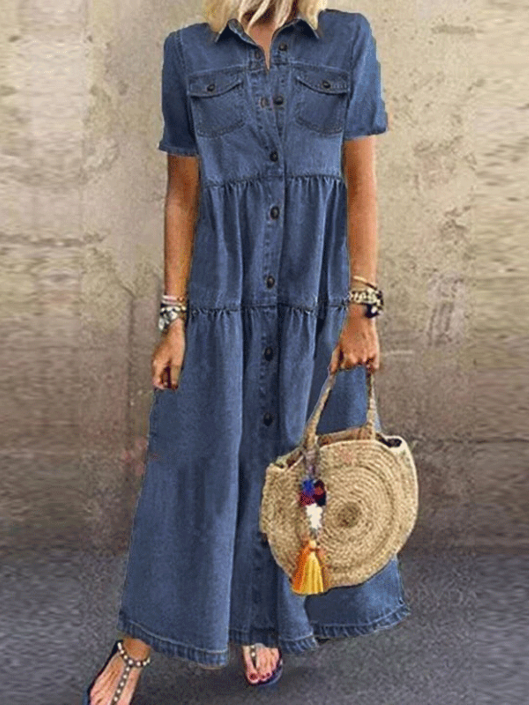 Blue Round Neck Short Sleeves Maxi Solid A-Line Cotton Dress