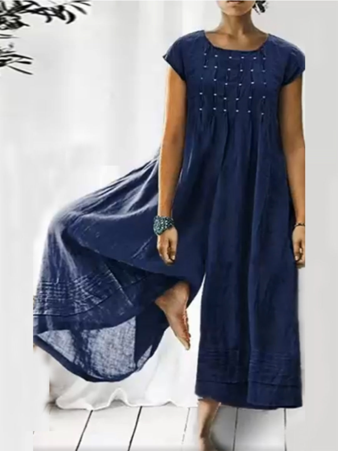 Blue Round Neck Short Sleeves Solid Cotton Jumpsuit