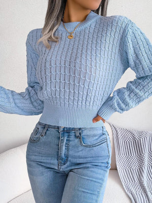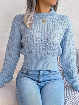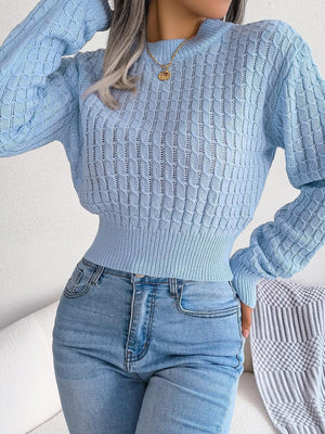 Get ready to turn heads with this stunning Blue Round Neck Solid Long Sleeves Pullover Polyester Sweater.