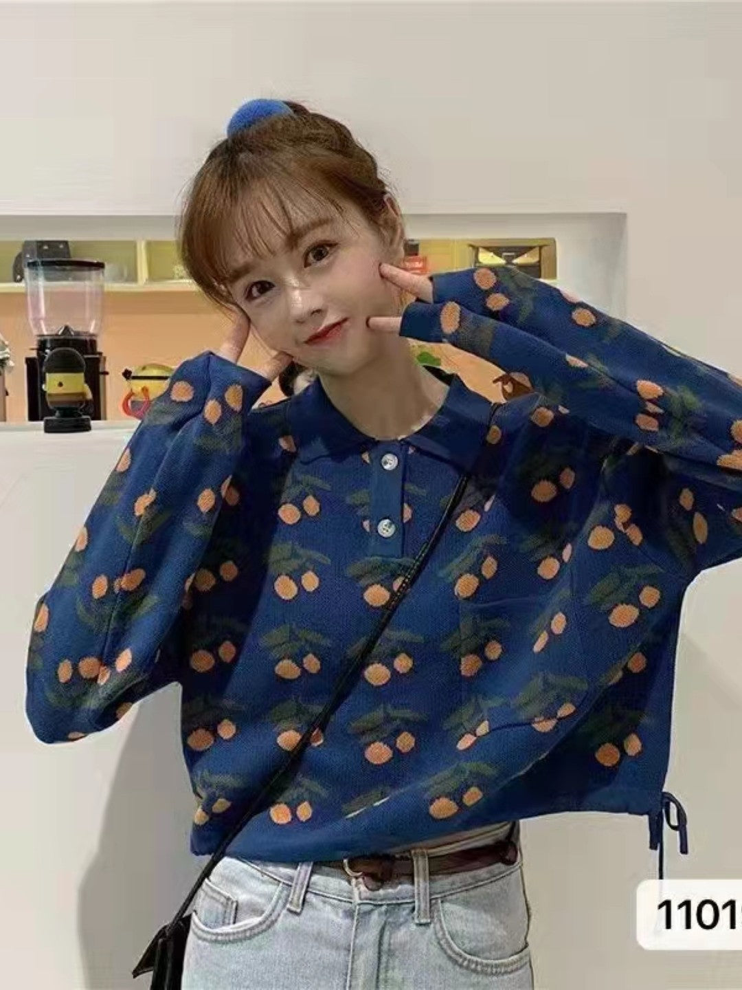 Blue Shirt Collar Long Sleeves Abstract Regular Sleeves Polyester Top