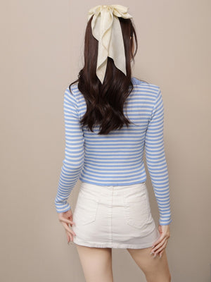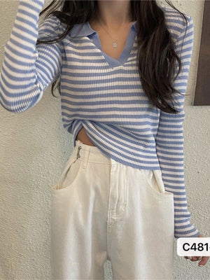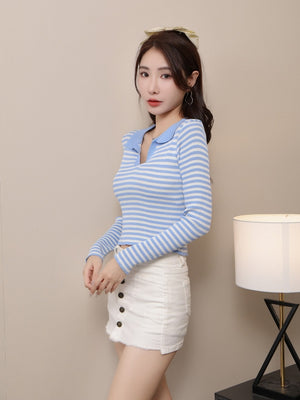 Blue Shirt Collar Long Sleeves Horizontal Stripes Top
