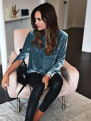 Blue Shirt Collar Solid Long Sleeves Woven Polyester Tops