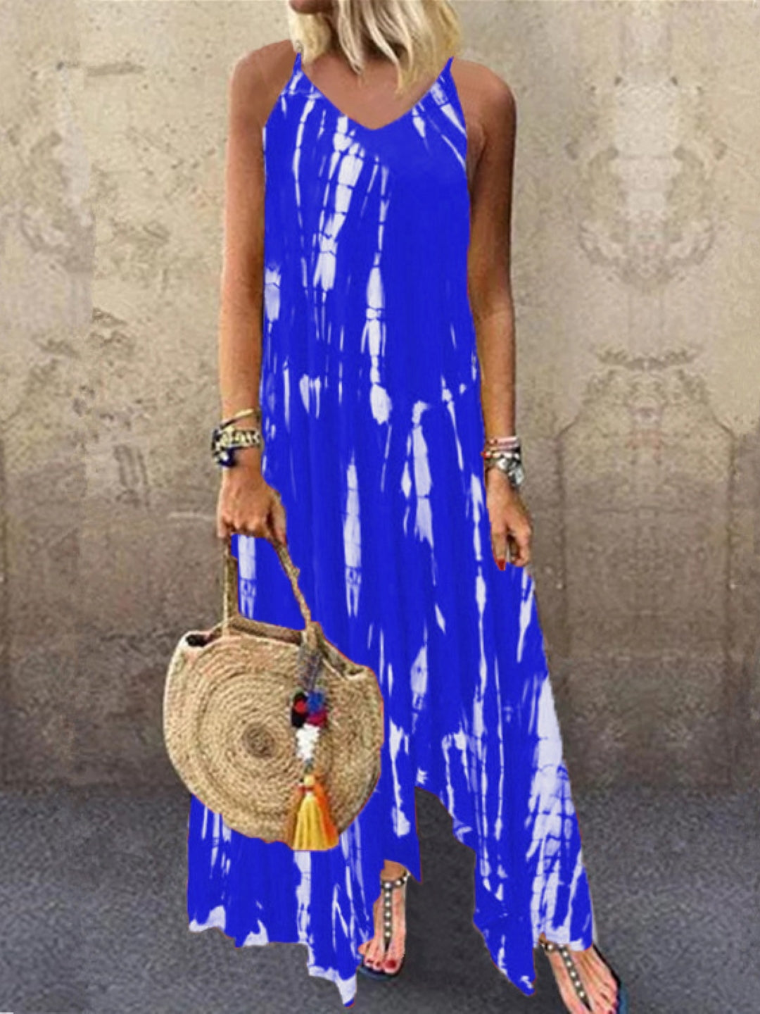 Blue Shoulder Straps A-Line Party Abstract Sleeveless Maxi Polyester Dress