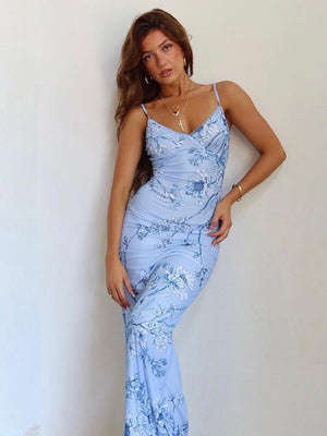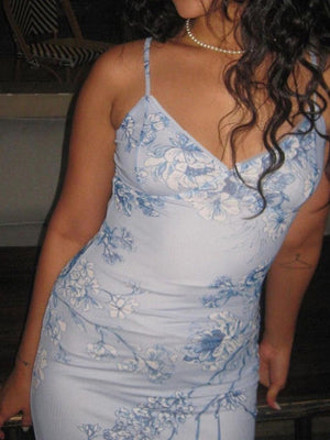 Blue Shoulder Straps Floral Bodycon Sleeveless Polyester Dress