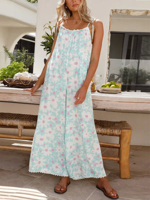Blue Shoulder Straps Sleeveless Printed Polyester Jumpsuit