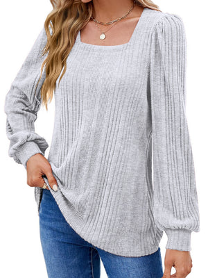 Blue Square Neck Solid Long Sleeves Polyester Top