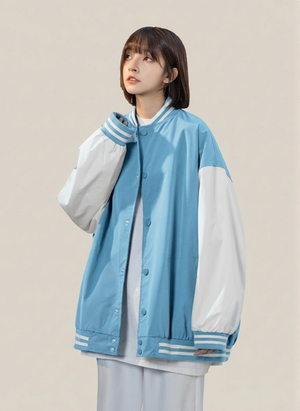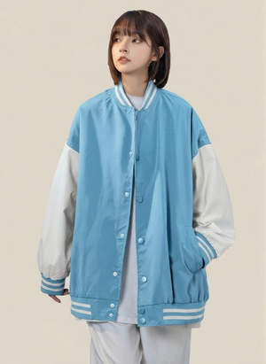 Blue Stand Collar Long Sleeves Striped Polyester Open Front Jacket