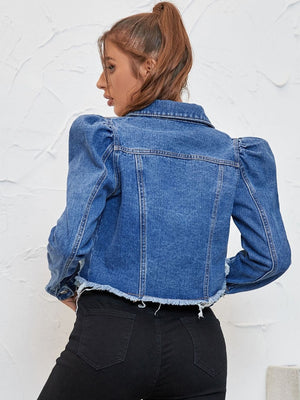 Blue Stand Collar Solid Long Sleeves Cotton Jacket