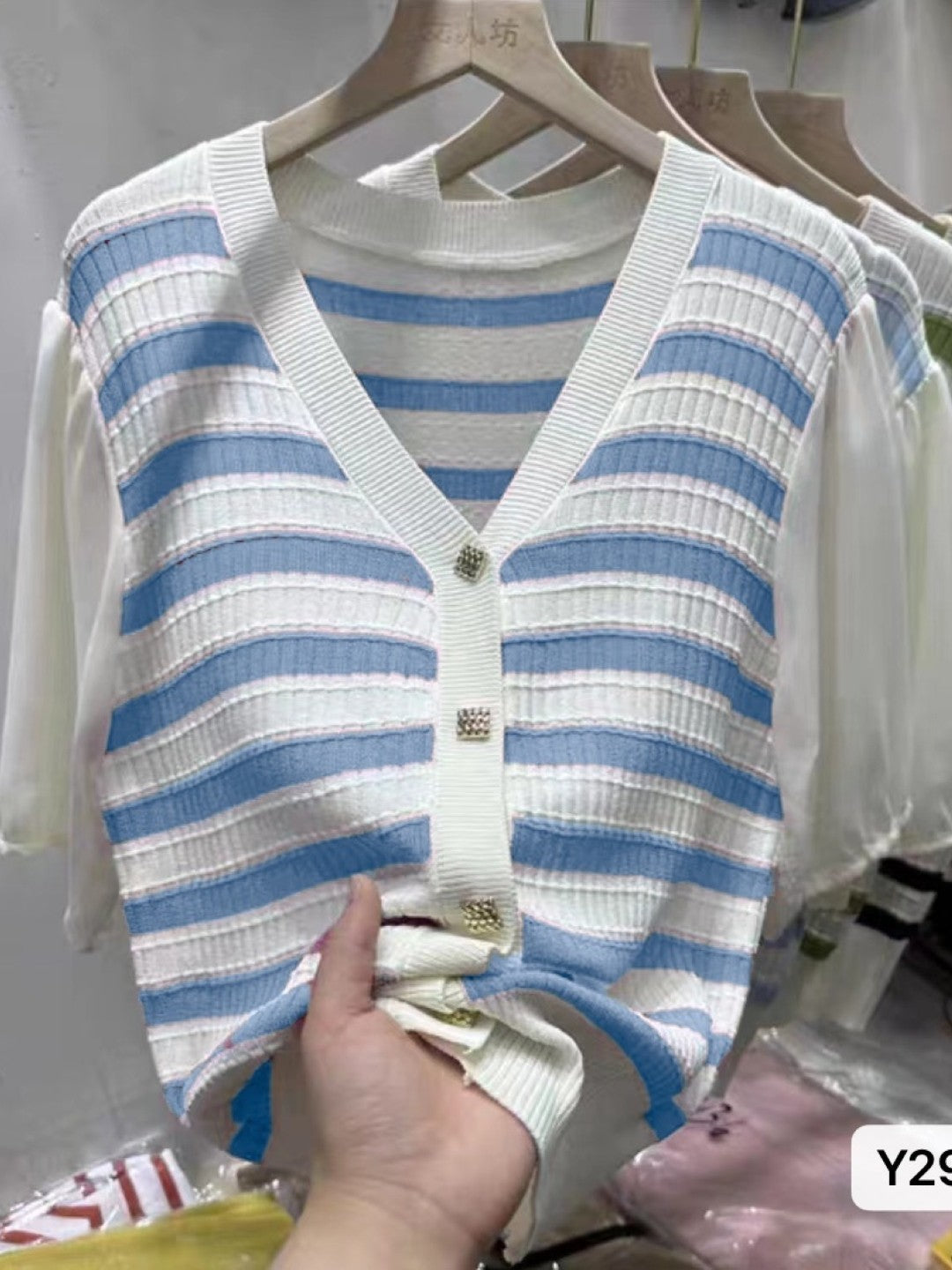 Blue V-Neck Short Sleeves Horizontal Stripes Top