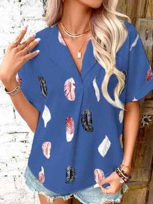 Blue V-Neck Short Sleeves Printed Polyester Top
