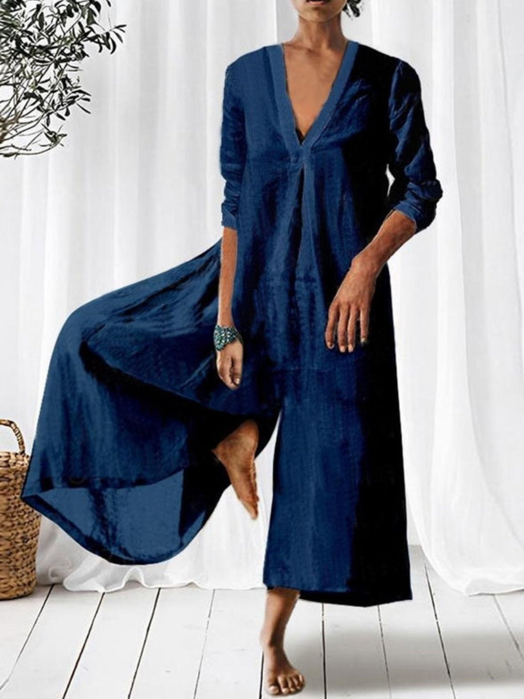 Introducing our Blue V-Neck Three-Quarter Sleeves Solid Cotton Jumpsuit, a versatile and stylish addition to your wardrobe. The three-quarter sleeves design and v-neck add a touch of elegance, while the solid black color exudes sophistication.