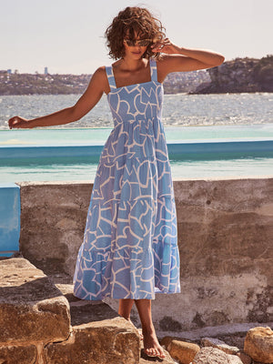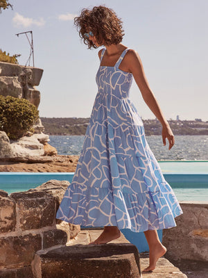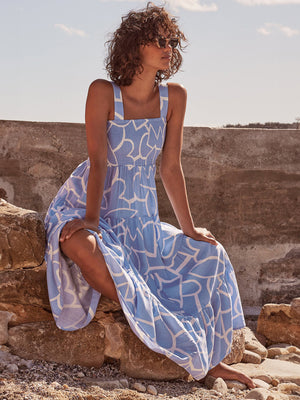 Embrace your feminine side and turn heads with our blue white square neck a-line floral sleeveless maxi polyester dress. Crafted from high-quality polyester, this dress offers a comfortable and lightweight feel, perfect for any occasion.