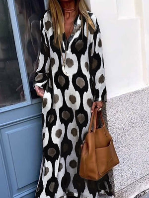 Step into effortless elegance with our Boho Black & White Maxi Kaftan Dress ?a must-have statement piece for every wardrobe. Designed for style and comfort, this loose-fitting dress features an abstract polka dot-inspired print in bold black, white, and taupe hues, perfect for casual days or elevated evenings. Crafted from lightweight fabric with a flowy silhouette, this kaftan dress offers breathability and grace in every step. The deep V-neckline adds a touch of sophistication, while the full-length design makes it easy to pair with heels, sandals, or boots for versatile looks year-round.
