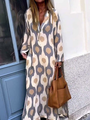 Elevate your wardrobe with the sophisticated and artistic Boho Grey Maxi Kaftan Dress. This stunning piece showcases an abstract ikat-inspired print in soft beige, ivory, and grey tones?erfect for making a relaxed yet refined statement. Crafted from lightweight, breathable fabric, this maxi kaftan features a flowy silhouette, deep V-neckline, and long sleeves?alancing comfort with timeless elegance. Ideal for holidays, resort wear, or casual outings when you want to feel effortlessly stylish.