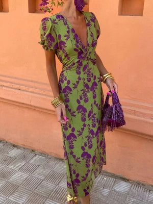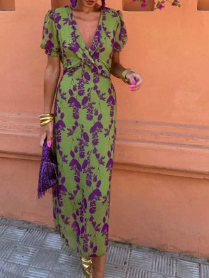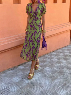 Bring bold elegance to your wardrobe with this Green & Purple Floral Midi Dress. Featuring a flattering wrap-style bodice, deep V-neckline, and puff sleeves, this dress blends vintage-inspired charm with modern sophistication. The vibrant green base with striking purple floral prints makes it a standout choice for any occasion, from brunch and garden parties to evening gatherings. Lightweight and comfortable, this midi dress offers a perfect balance of style and ease, ensuring you look chic and confident wherever you go.