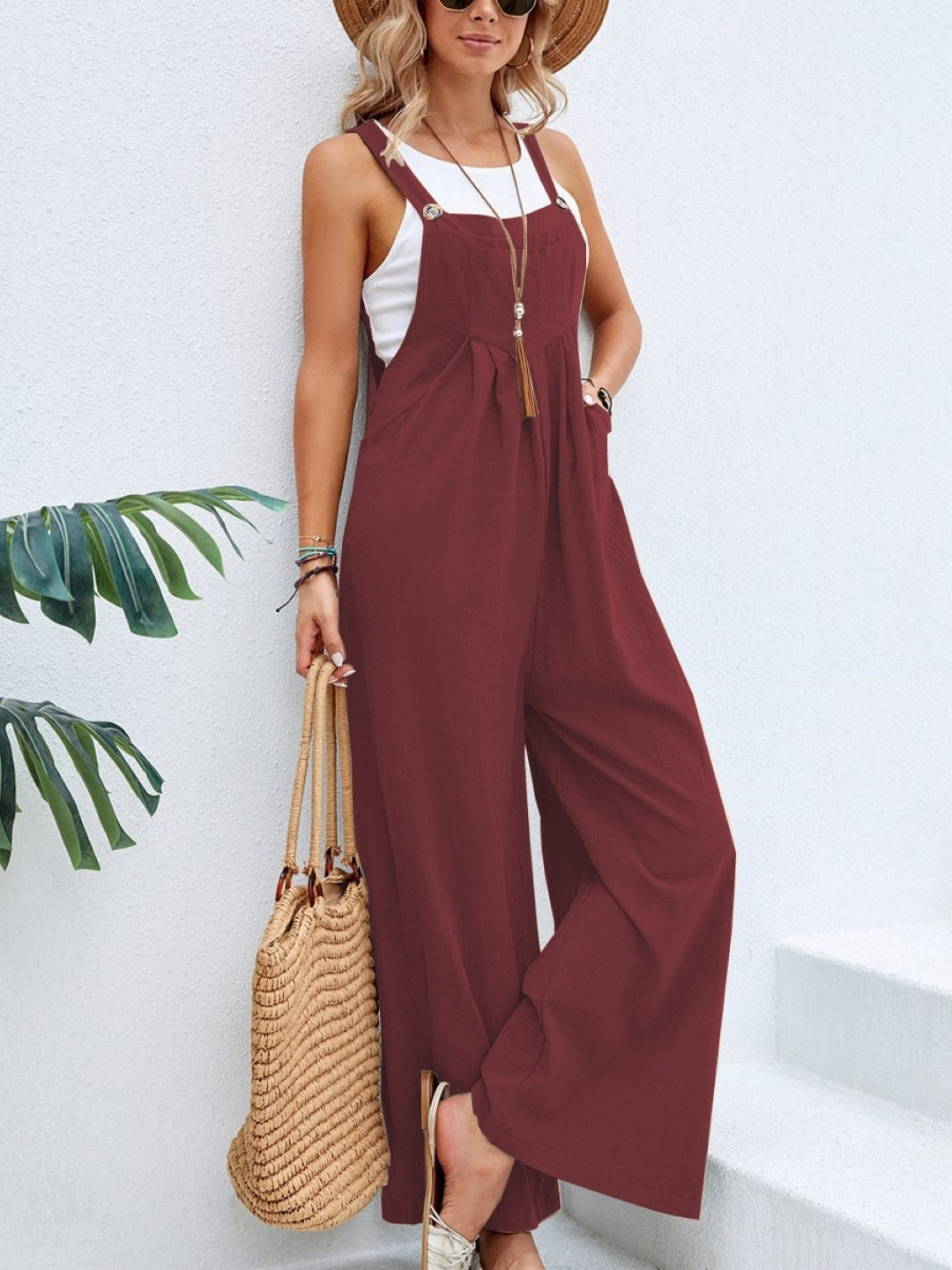 Brick Red Solid Sleeveless Shoulder Straps Polyester Playsuit