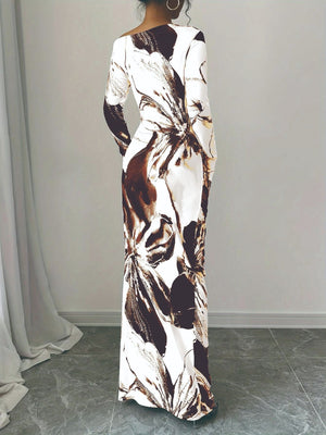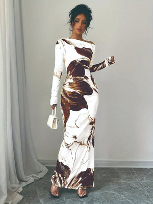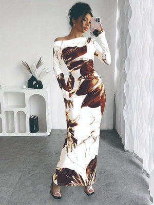 Step into artistic elegance with the Brown Abstract Print Bodycon Maxi Dress. Featuring a captivating mix of warm brown tones on a crisp white backdrop, this dress combines bold design with a sleek silhouette. The off-shoulder neckline and long sleeves add a refined touch, while the body-hugging fit enhances your curves for a striking look. Crafted from a smooth, stretchy fabric, this maxi dress is ideal for evening events, gallery nights, or upscale dinners. Pair it with neutral heels and a minimalist bag for a clean, fashion-forward ensemble.