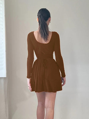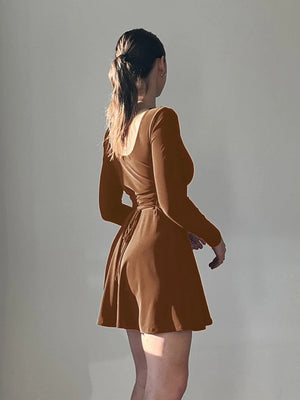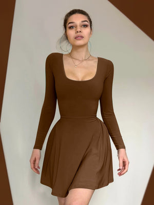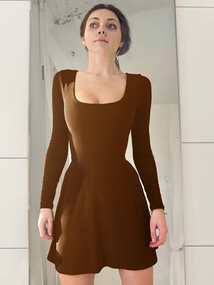 Brown Boat Neck Solid Long Sleeves Above Knees A-Line Polyester Dress