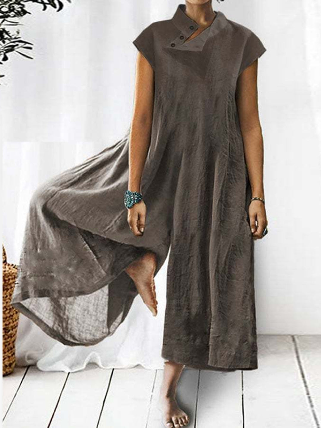 Brown Halter Neck Short Sleeves Solid Cotton Jumpsuit