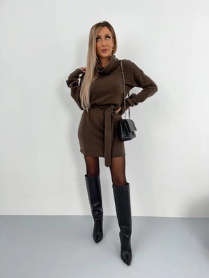 Brown High Neck Solid Long Sleeves Fit and Flare Polyester Above Knee Dress