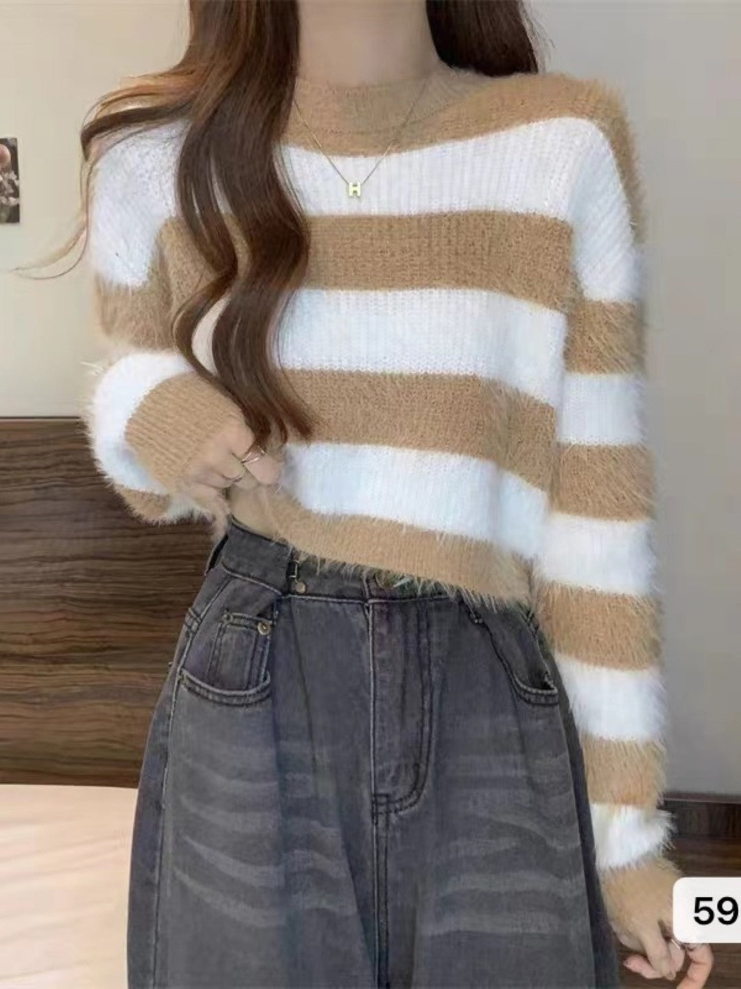 Brown Round Neck Long Sleeves Horizontal Stripes Regular Sleeves Acrylic Top
