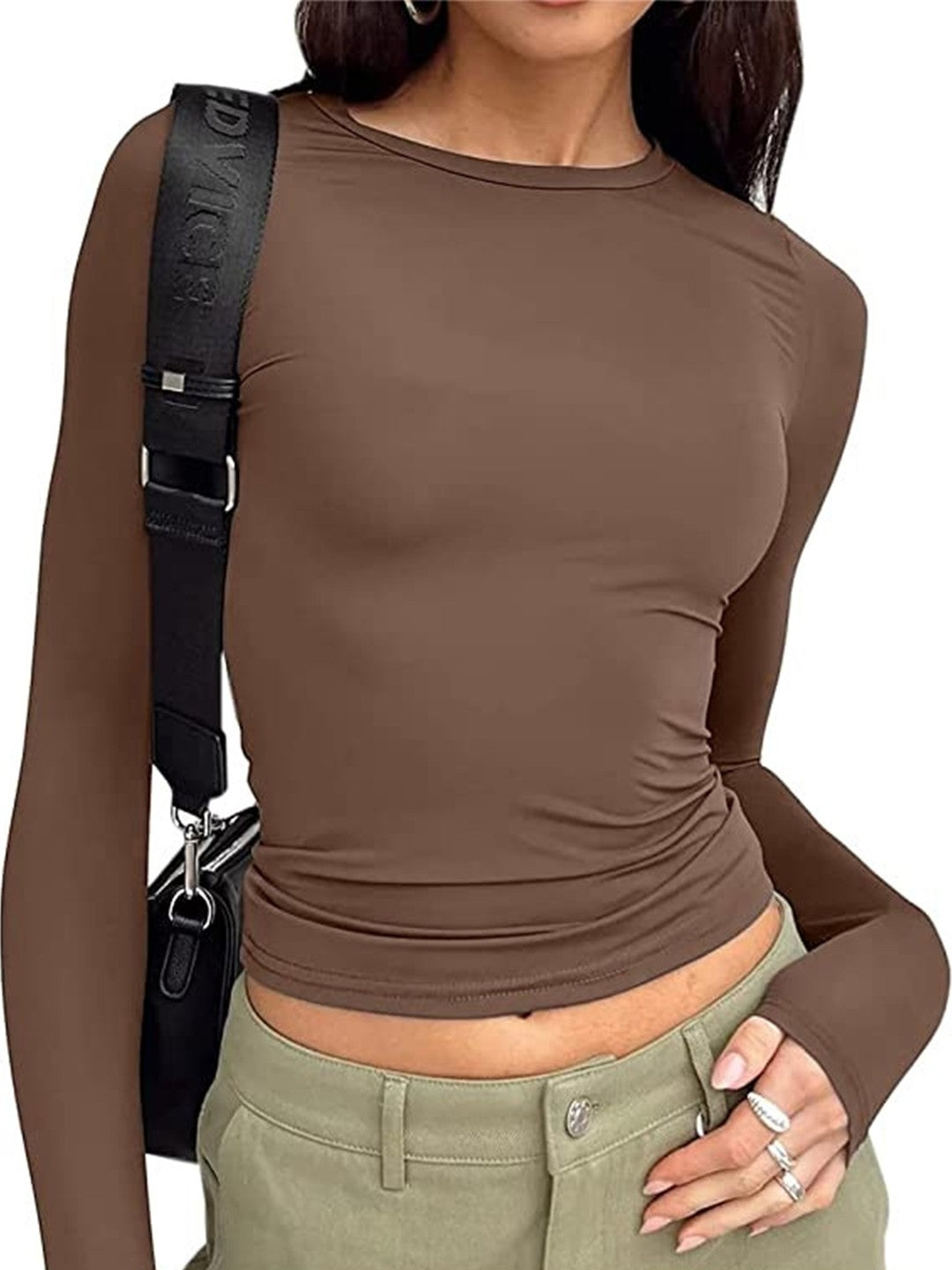 Brown Round Neck Long Sleeves Solid Polyester Top