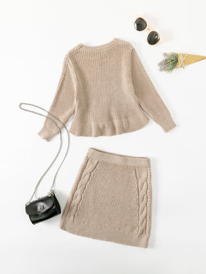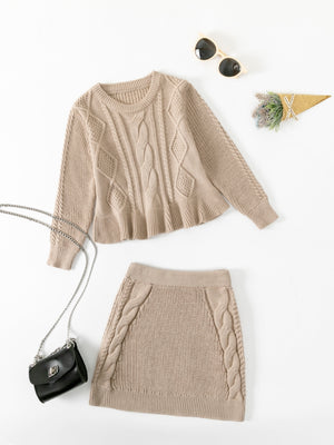 Brown Round Neck Long Sleeves Viscose Rayon Solid Skirt Top Set