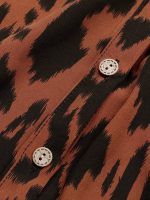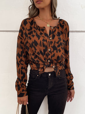 Brown Round Neck Printed Long Sleeves Polyester Top