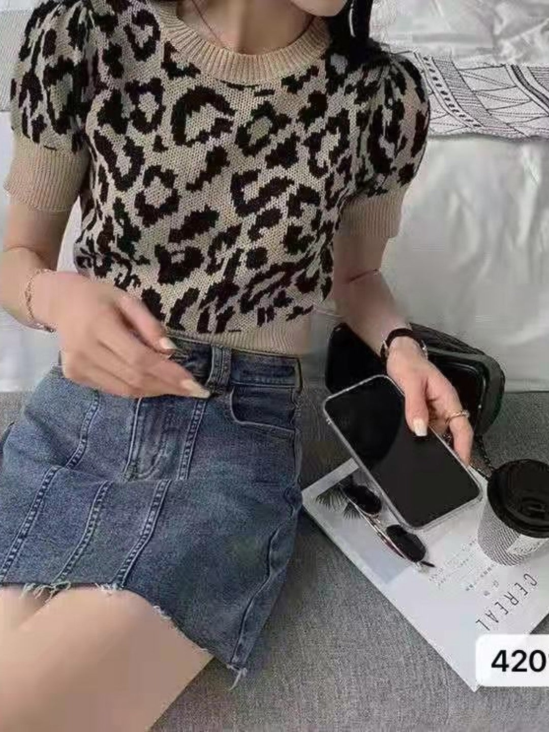Brown Round Neck Short Sleeves Animal Regular Sleeves Viscose Rayon Top