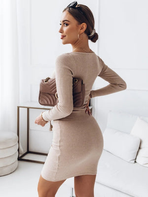 Brown Round Neck Solid Long Sleeves Bodycon Polyester Knee Length Dress