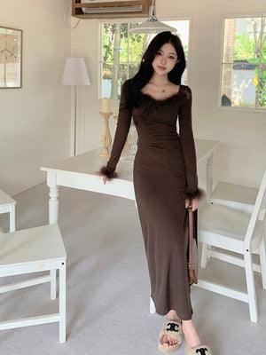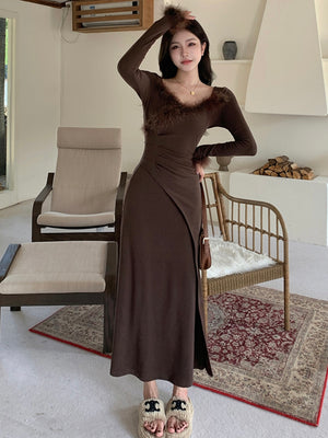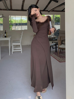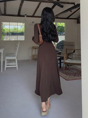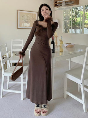 Brown Round Neck Solid Long Sleeves Maxi A-Line Polyester Dress