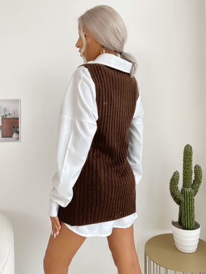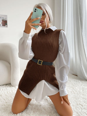 Brown Round Neck Solid Sleeveless Polyester Sweater