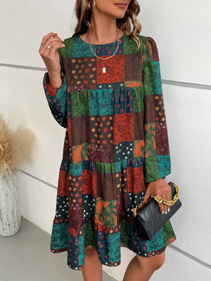 Brown Round Neck Tribal Long Sleeves A-Line Polyester Maxi Dress