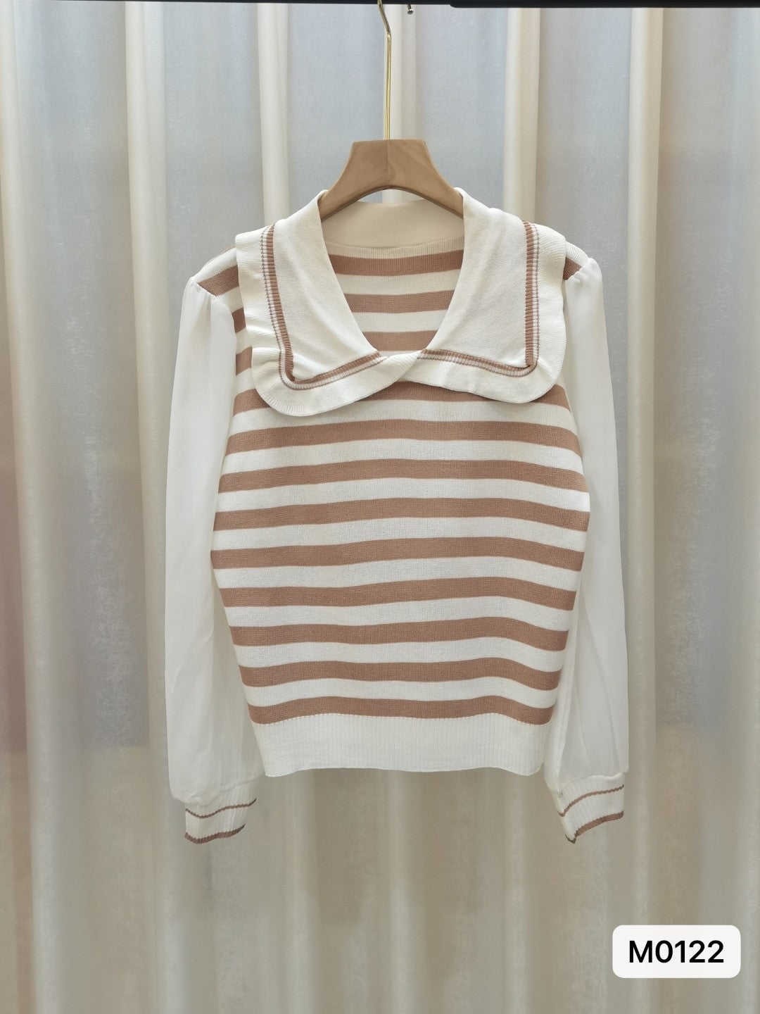 Brown Shirt Collar Long Sleeves Horizontal Stripes Top