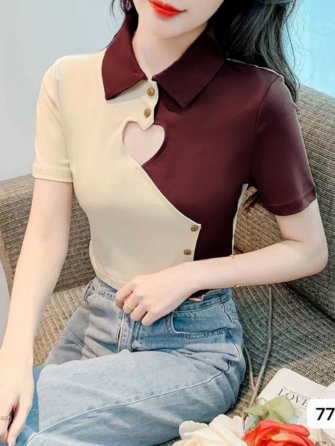 Brown Shirt Collar Short Sleeves Colourblocked Top