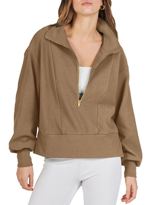 Brown Shirt Collar Solid Long Sleeves Polyester Top