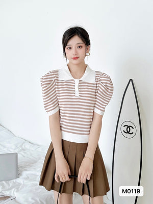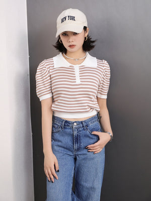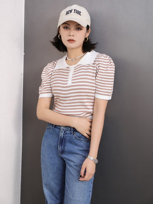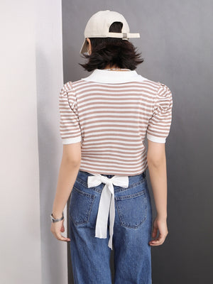 Brown Shirt Collar Three-Quarter Sleeves Horizontal Stripes Top