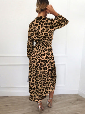 Brown V-Neck A-Line Long Sleeves Animal Maxi Polyester Dress