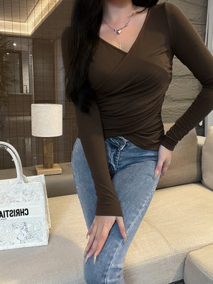 Brown V-Neck Long Sleeves Solid Opaque Polyester Top