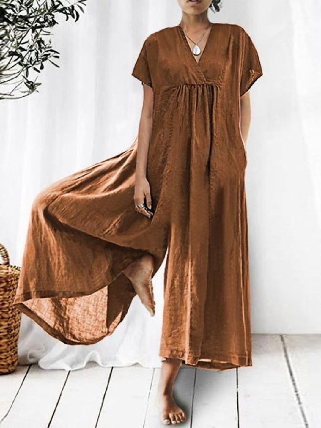 Brown V-Neck Short Sleeves Solid Cotton Jumpsuit