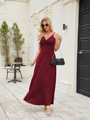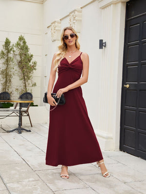 Step out in style with this elegant burgundy maxi dress. Featuring a flattering twist front detail and adjustable spaghetti straps, this dress is perfect for any occasion, from casual outings to evening events. Made from soft, flowy fabric, it offers comfort and sophistication in one beautiful piece. Pair it with your favorite heels and accessories for a stunning look.