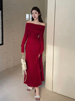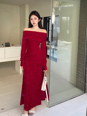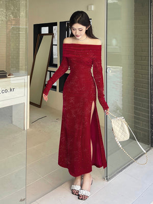 Elevate your wardrobe with our burgundy off-shoulder solid long sleeves maxi bodycon polyester dress. This stunning dress features a flattering off-shoulder neckline,long sleeves, and a bodycon silhouette that hugs your curves in all the right places.