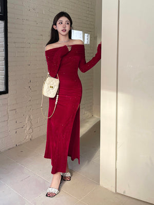 Burgundy Off-Shoulder Solid Long Sleeves Maxi Bodycon Polyester Dress