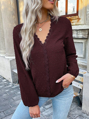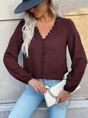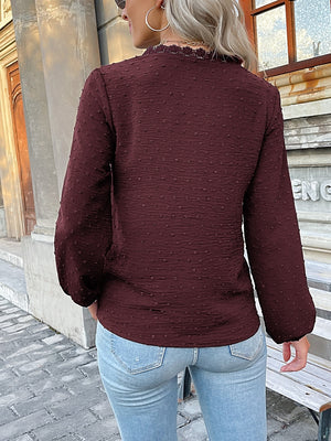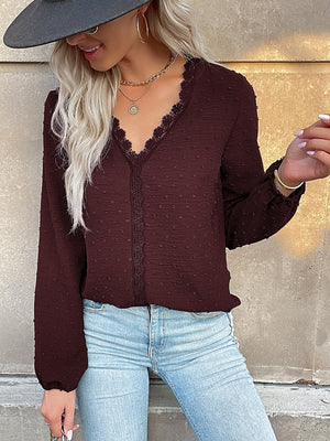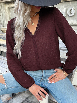 Burgundy V-Neck Solid Long Sleeves Polyester Top