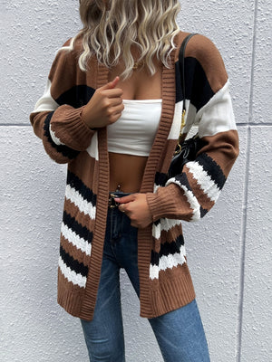 Add some flair to your outfit with this coffee brown V-neck colourblocked acrylic cardigan. The long sleeves and soft material offer both style and comfort.