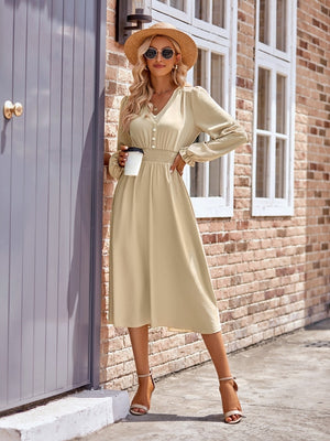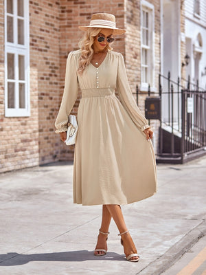 This elegant A-Line dress is made from high-quality cream polyester, perfect for any occasion. The flattering silhouette and versatile color make it a must-have in any wardrobe. The dress features a classic v-neck neckline and a comfortable fit that will make you feel confident and stylish.