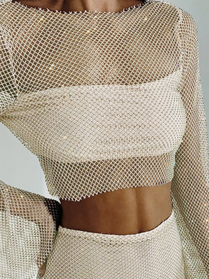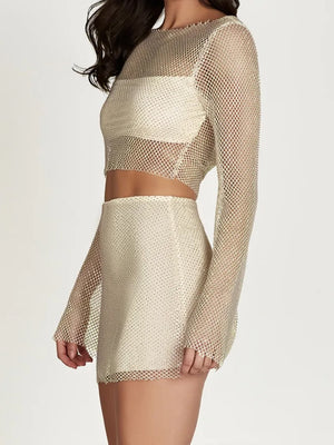 Embrace sophistication with our Cream Mesh Top & Skirt Set. Ideal for evening events, it offers a chic mesh top and matching skirt in a timeless cream color for an elegant look.