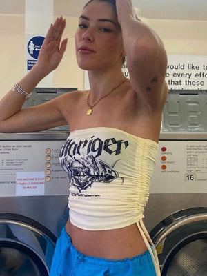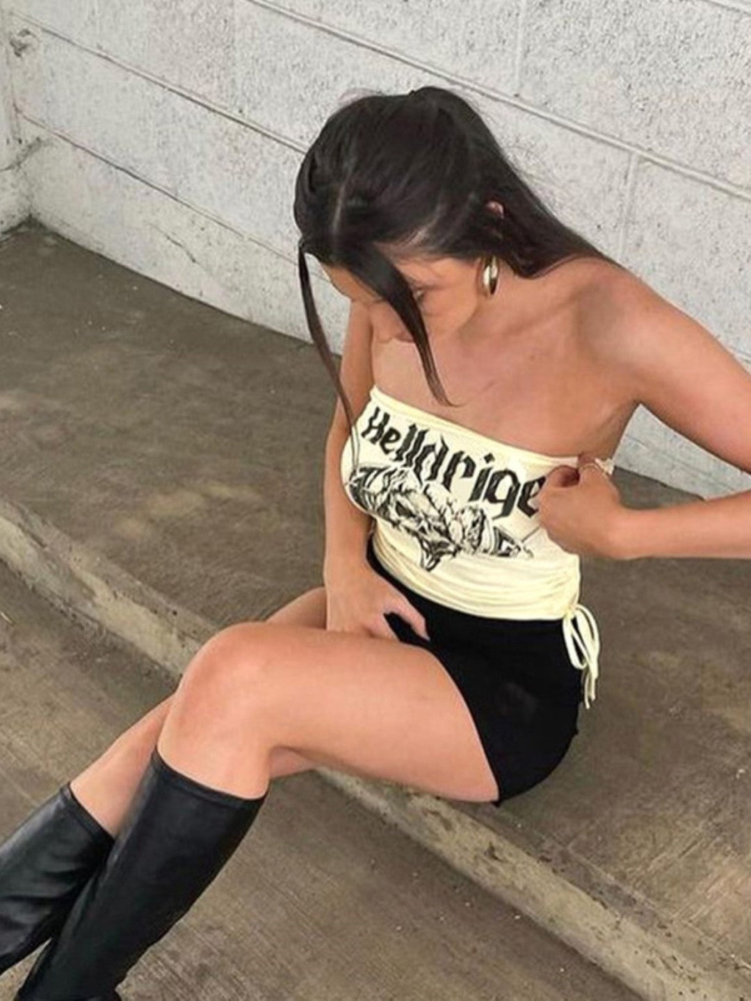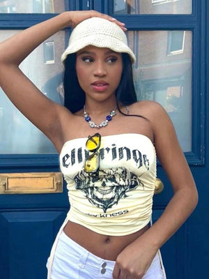 Cream One Shoulder Printed Sleeveless Polyester Crop Top