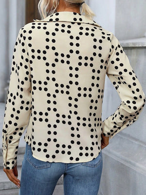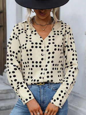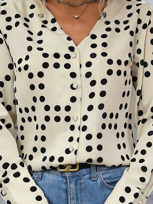 Cream Polka Dots V-Neck Long Sleeves Polyester Top